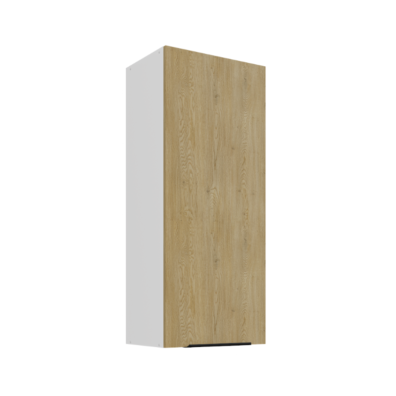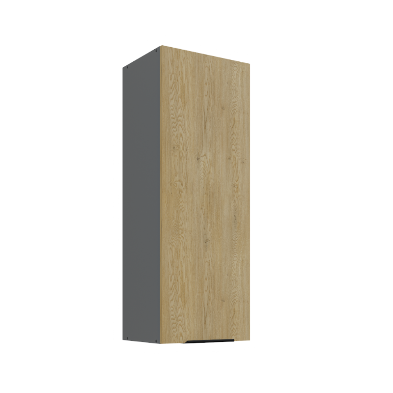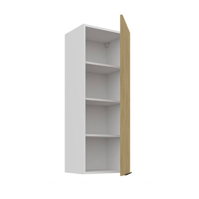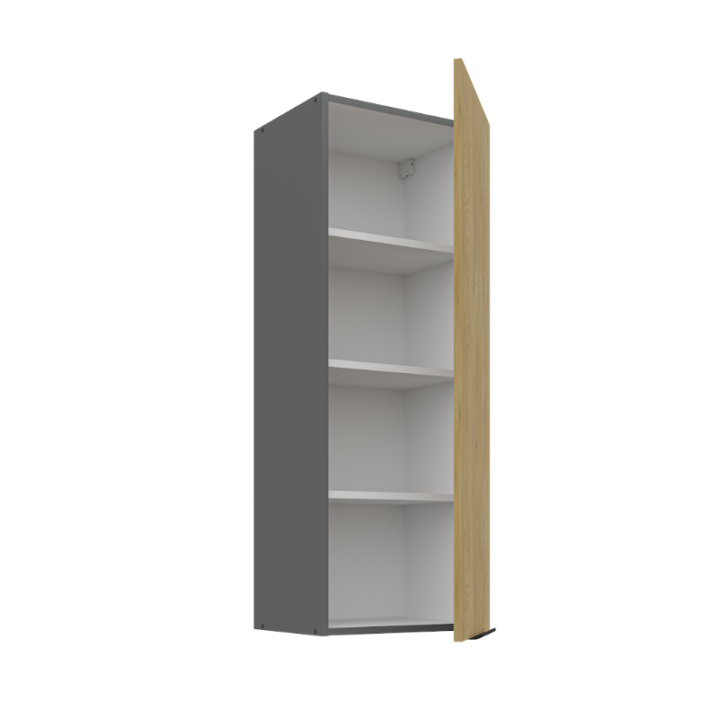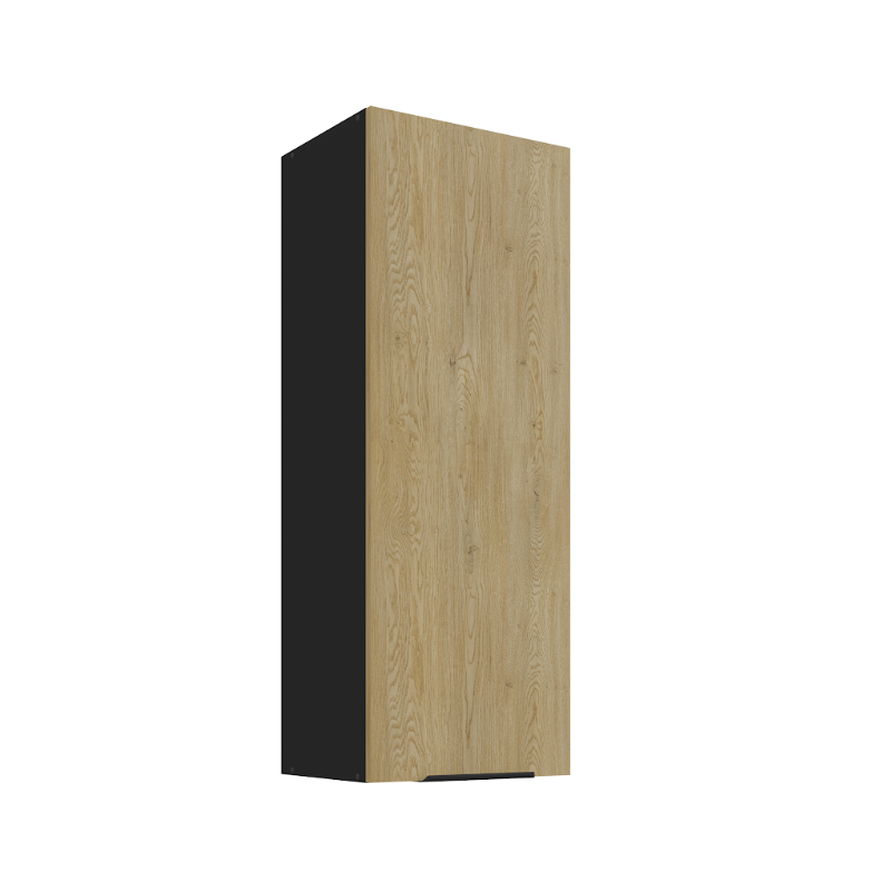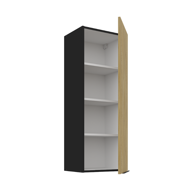Horná skrinka Cremona 40 G-108 1F je vysoká 1-dverová závesná skrinka v modernom štýle. Otváranie zabezpečuje čierny úchytový profil, ktorý je umiestnený v spodnej časti dvierok a ladí s tmavým korpusom skrinky. Vnútorný priestor je prakticky rozdelený tromi pevnými policami, ktoré vytvárajú štyri úložné úrovne.