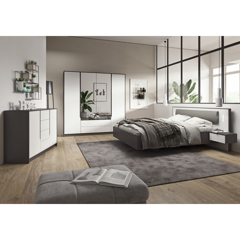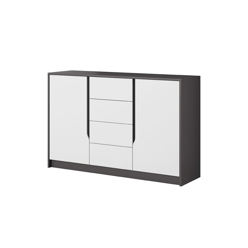 Moderná komoda do spálne SEGA - s výborným dizajnom a kvalitou. Praktická komoda je vo farebnom prevedení biela matná / grafit. Korpusy aj dvierka sú vyrobené z kvalitnej DTD dosky odolnej voči vlhkosti a poškriabaniu. Hrúbka je 16 mm. Hrany sú olepené ABS páskou na predĺženie životnosti nábytku. Lišty sú potiahnuté fóliou na MDF, výsuvy na zásuvkách majú kvalitné guličkové vedenie, bezúchytkový systém PUSH TO OPEN.