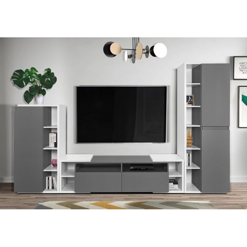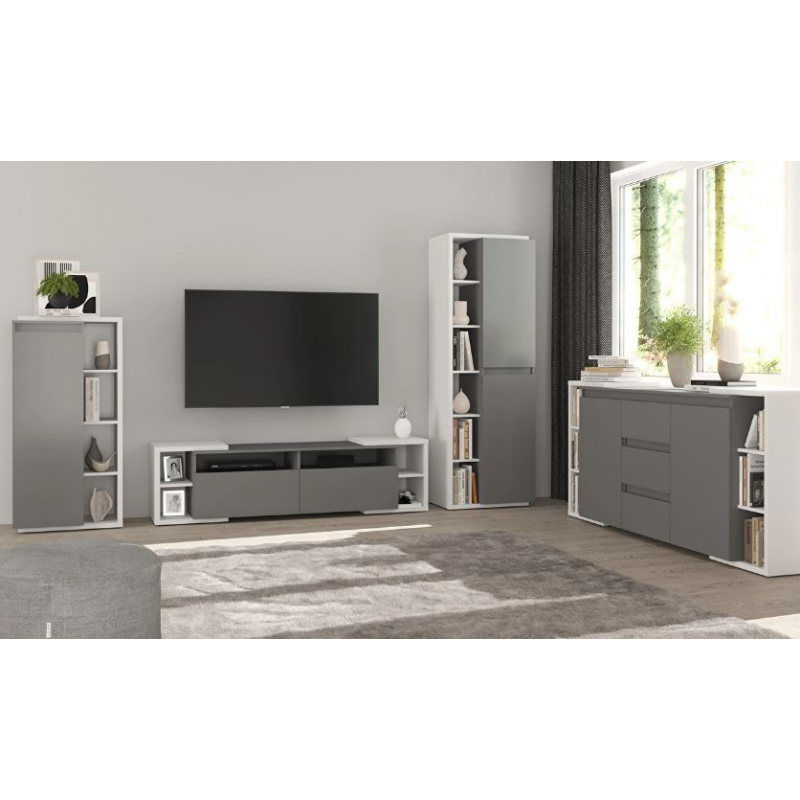 Vysoká skrinka s regálovou časťou je výborným prvkom do obývacej izby. Nielenže za dvomi plnými dvierkami môžete ukryť hocičo, ale do otvorenej časti naopak môžete vystaviť rôzne ocenenia alebo fotografie, ktoré chcete, aby boli na očiach. Skrinka má spolu až 9 políc.