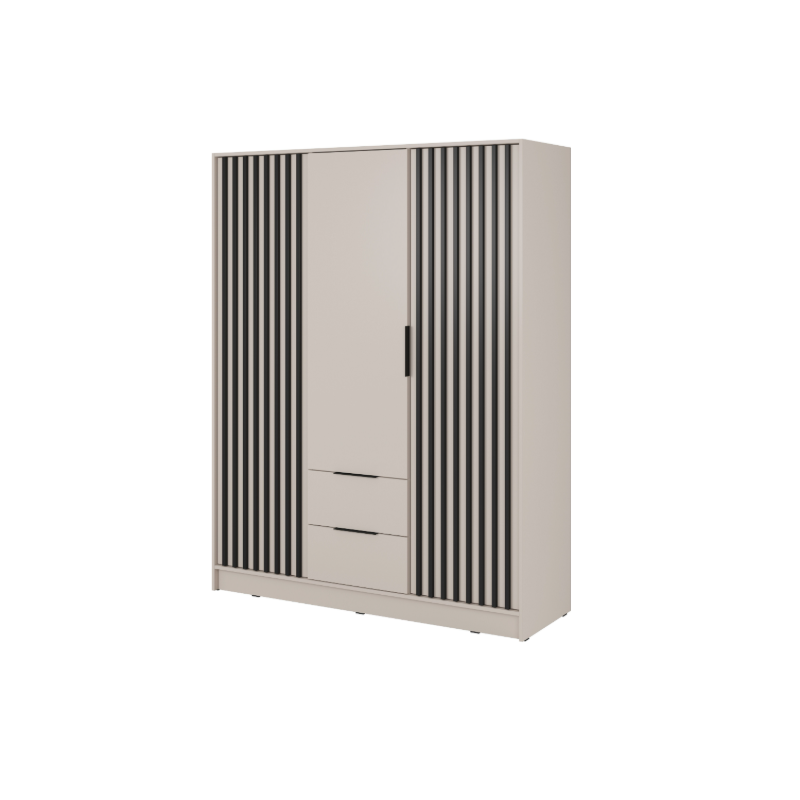Dizajnová skriňa Nelly 3D má zaujímavý vzhľad, ktorý ocenia všetci milovníci moderných interiérov . Trojdverová skriňa vyrobená z laminovanej dosky s hrúbkou 16 mm, má plastové čierne úchytky a na oboch bočných dvierkach dekoračné lamely v čiernom alebo dub artisan prevedení. Praktická skriňa disponuje policovými časťami z oboch strán a v strede 2 priestrannými zásuvkami, nad ktorými sa nachádza vešiaková tyč na zavesenie košieľ, šiat ale aj búnd.