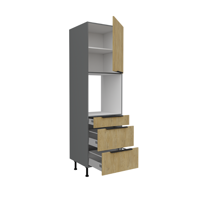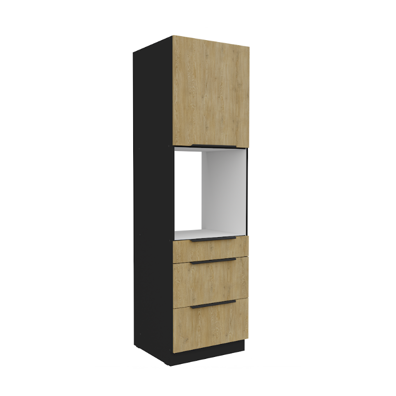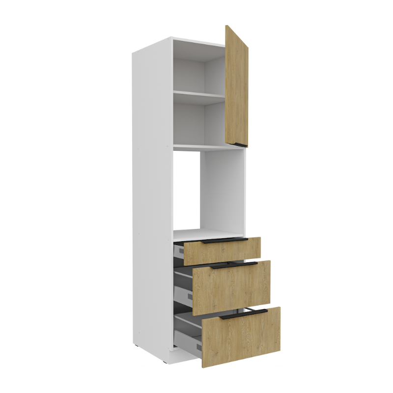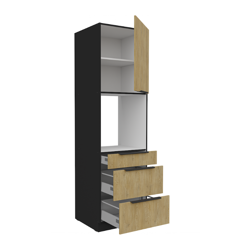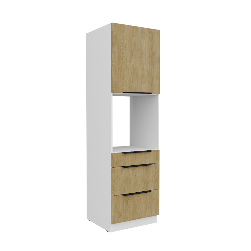 Skrinka Cremona WH 60 DPS-210 3S1F je vysoká kuchynská skrinka určená na zabudovanie rúry. Horná časť disponuje uzatvárateľným priestorom s dvierkami a policou, spodná časť je tvorená tromi výsuvnými zásuvkami pre uloženie kuchynských potrieb. V strede sa nachádza otvor pre vstavanú rúru. Dvierka a čelá zásuviek sú doplnené čiernymi úchytovými profilmi.